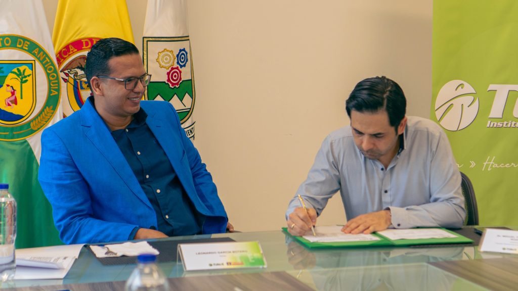 El rector del TdeA Institución Universitaria, Leonardo García Botero, y el subdirector regional noroccidental de la Fiscalía General de la Nación, Miguel Fernando Vega Rodríguez, firmaron el convenio de cooperación entre las instituciones con el objetivo de formalizar procesos de prácticas de los estudiantes en los niveles tecnológico y profesional, así como fortalecer acciones enmarcadas en la misión para aportar al trabajo de ambas institucionales.
